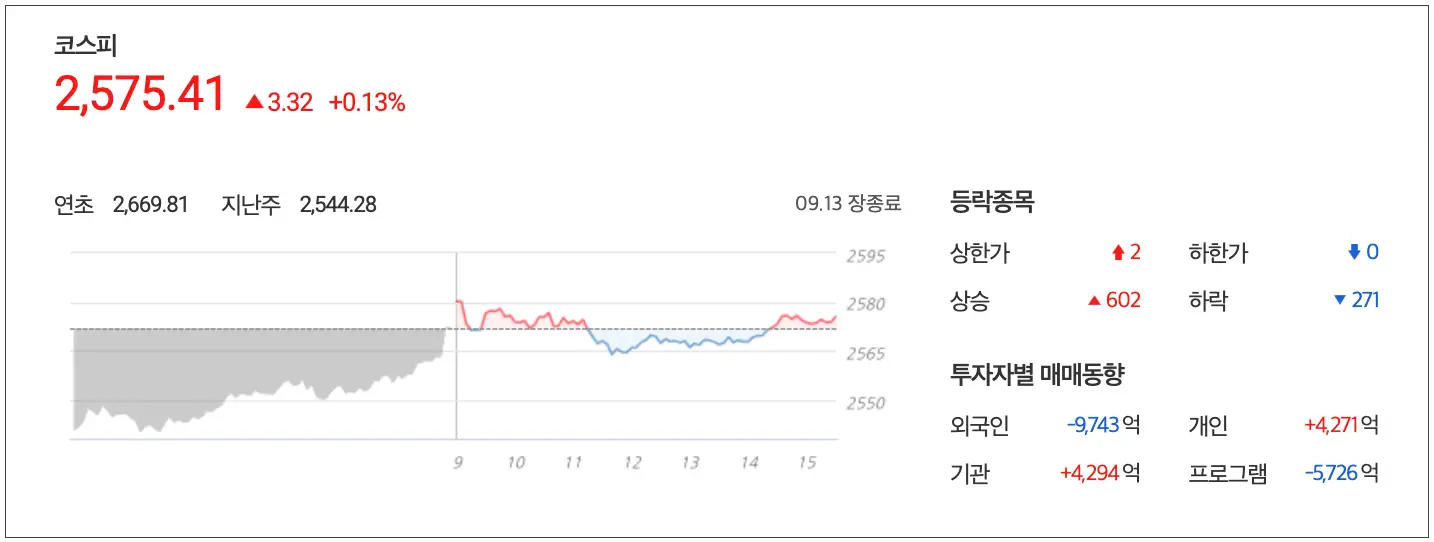 코스피는 전일종가보다 0.13% 상승한 2,575.41 point로 마감 외국인은 9,743억을 매도했으며 기관과 개인은 각각 4,294억과 4,271을 순매수했습니다.