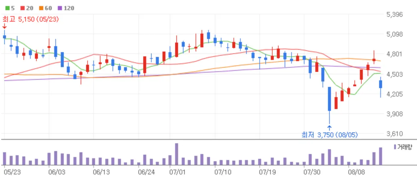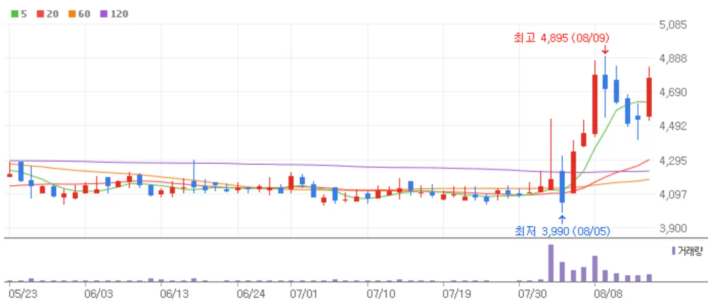 최근 저점 3,990원을 기록 후 점차 상승세를 높여가고 있는 기업으로 저점 대비 19% 상승한 가격대에 위치하고 있습니다.
