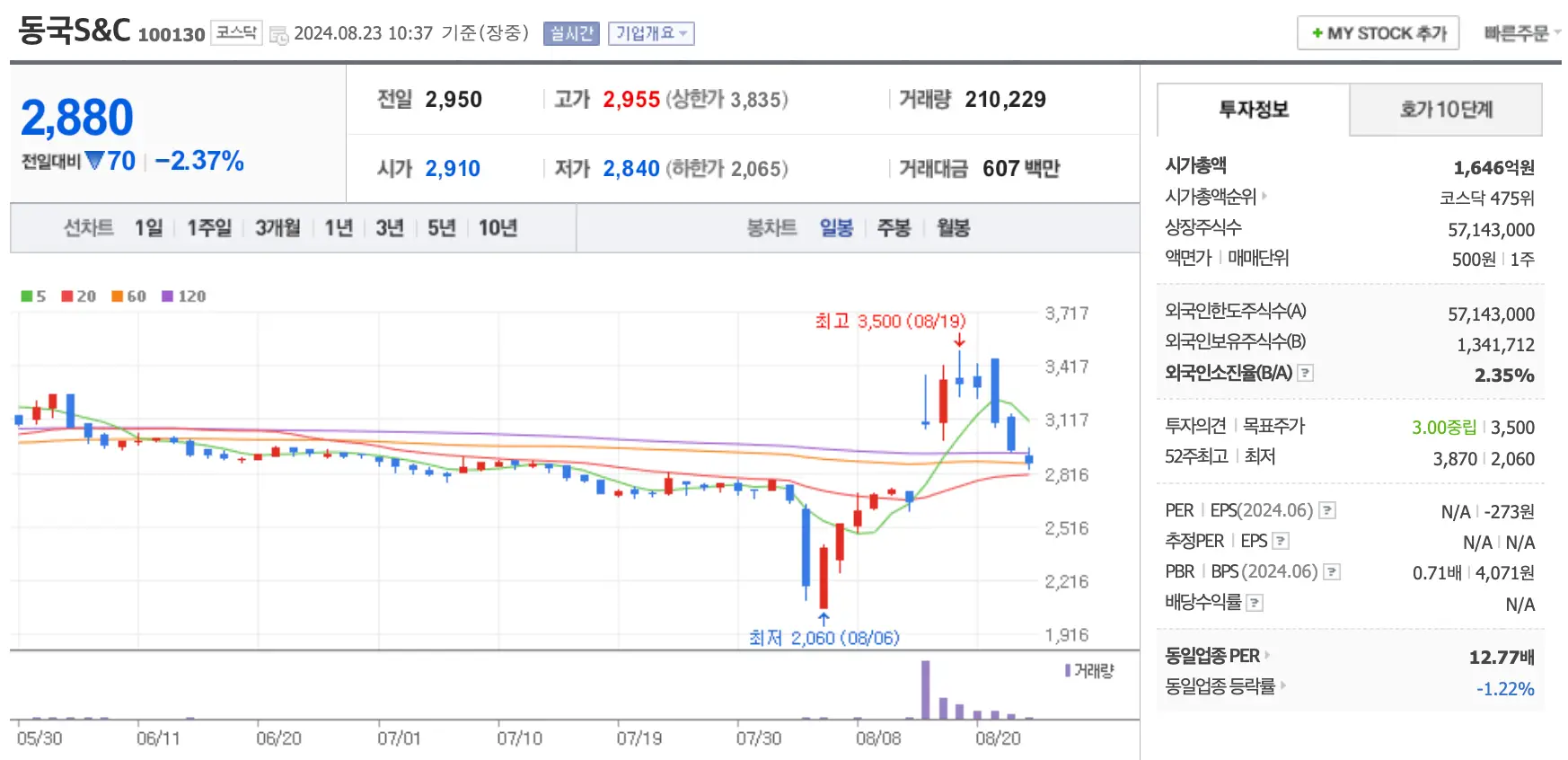 씨에스윈드는 2분기 영업이익 추정 220%를 웃돌며 1,290억을 달성 어닝서프라이즈를 기록하며 큰 폭의 상승을 기록 최근 상승분에 대해 조정 중에 있습니다.