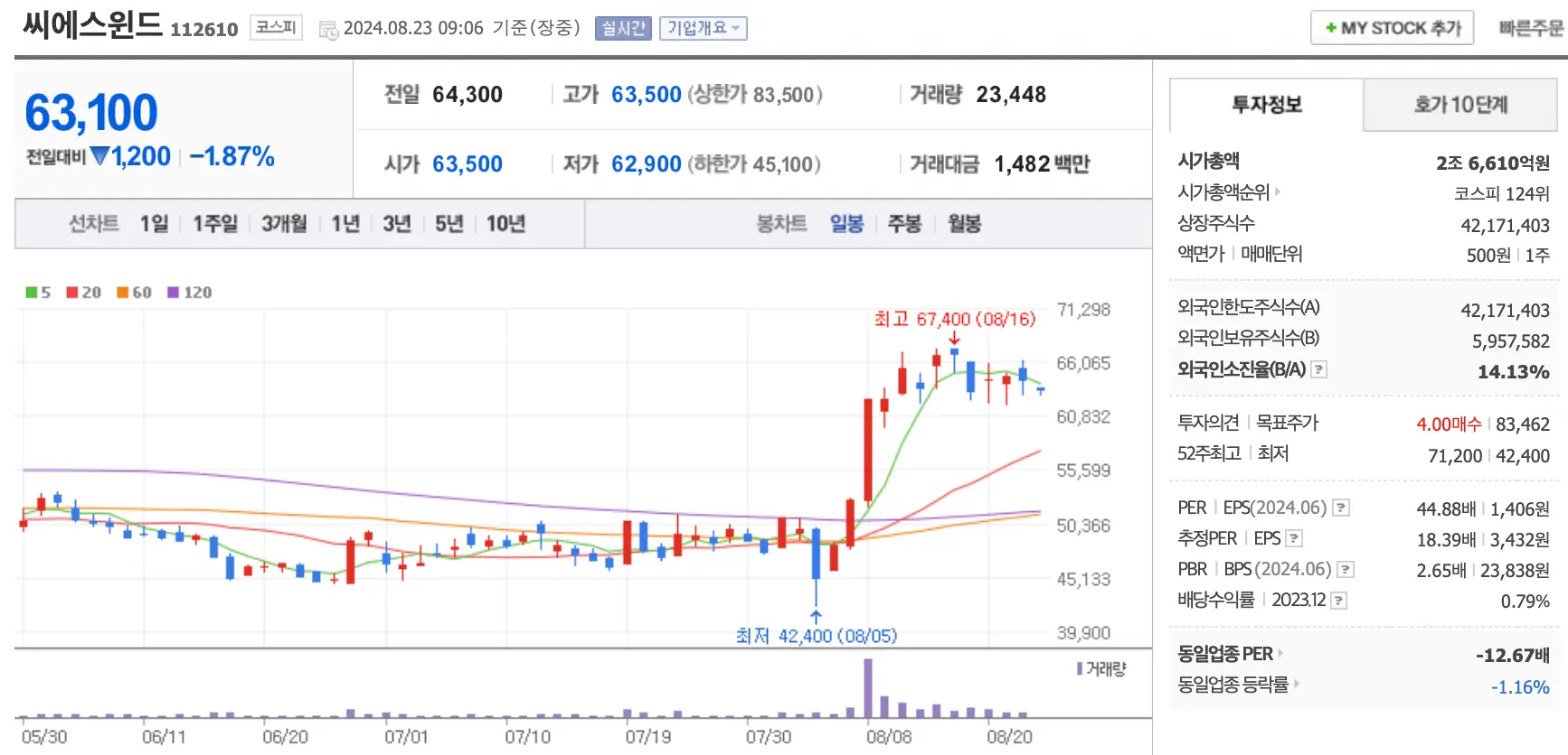 해상풍력종목의 대표종목이라고 할 수 있는 씨에스윈드는 풍력타워 부품 생산과 함께 해상풍력 하부구조물 생산사업을 영위하고 있는 기업입니다. 아시아 유일 행상풍력 타워를 제조할 수 있는 인증을 보유한 기업으로 금리인하의 호재와 함께 미국과 유럽 등의 대규모 해상풍력 발전 수요 증가에 따른 글로벌 시장 확대로 기업이익도 가파르게 성장할 것으로 보입니다.