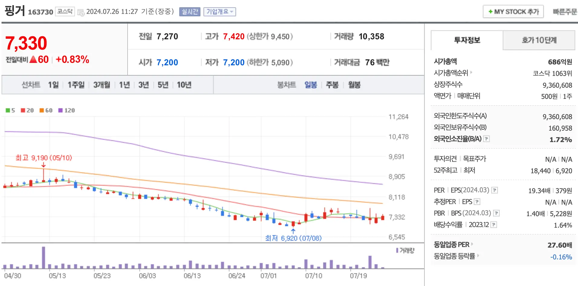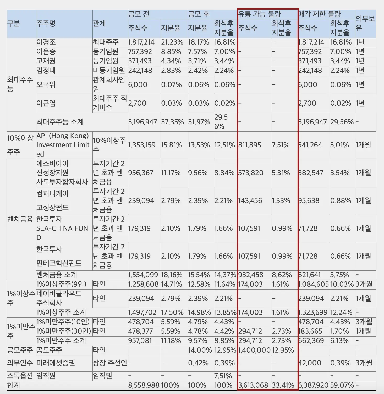 | 상장 후 유통물량 | 3,613,068주(33.41%) |