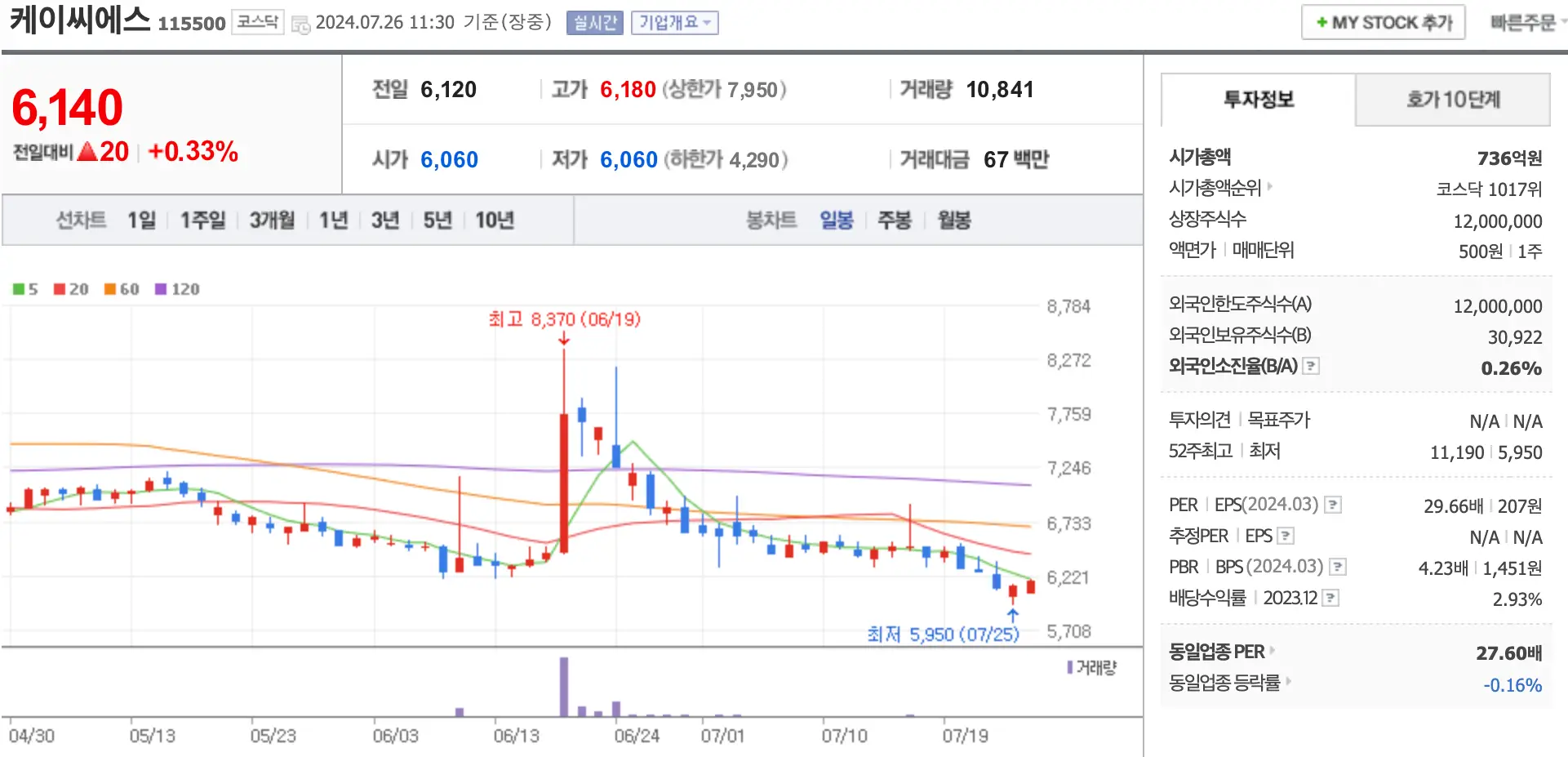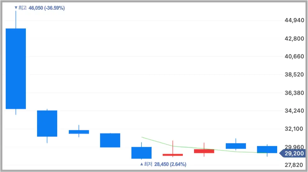 지난 7월 2일에 상장한 이노스페이스는 341.24:1의 경쟁률을 보이며 공모흥행에는 크게 성공했지만 4장 초반 6%의 강세를 끝으로 공모가 대비 8,850원이 하락한 3만 4,450원에 마감하였습니다.