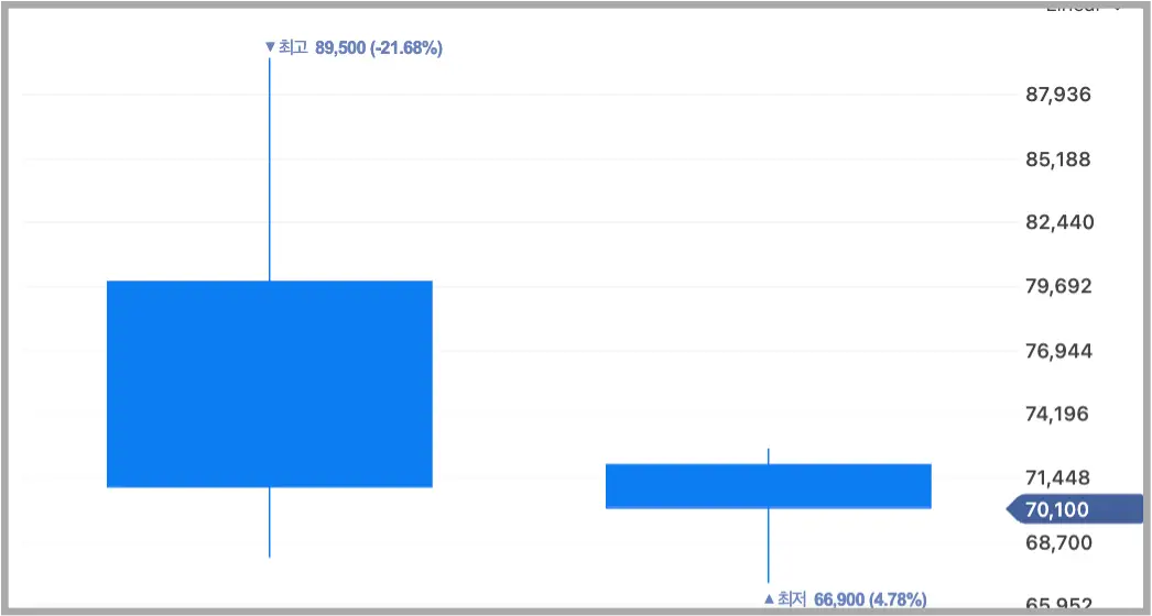 이튿날 차익매물이 쏟아지며 70,100원에 마감하였습니다.
