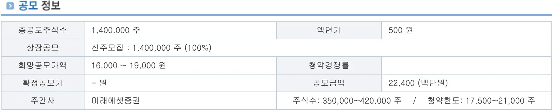 | 총공모주식수 | 140만주(100%신주) |