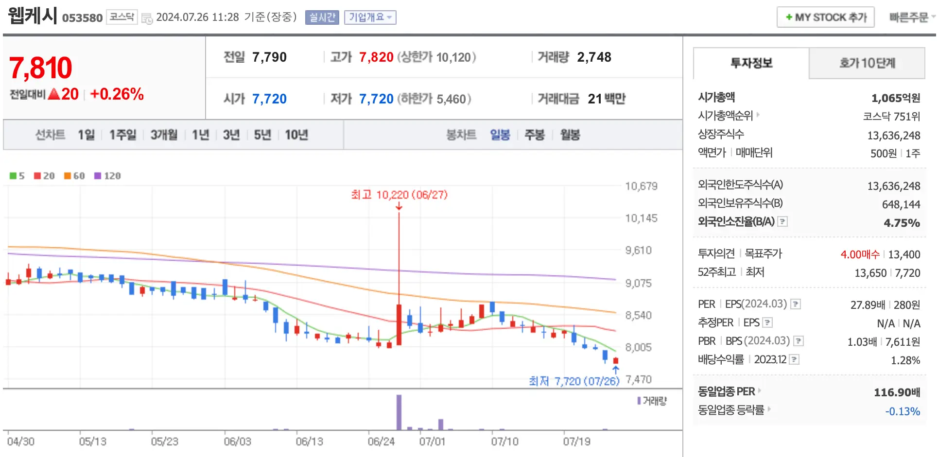 2위 업체로는 웹케시들 들 수 있고 1,065억 원의 시가총액으로 코스닥 751위를 기록 중이며 전일보다 20원 상승한 7,810원에 거래되고 있습니다.