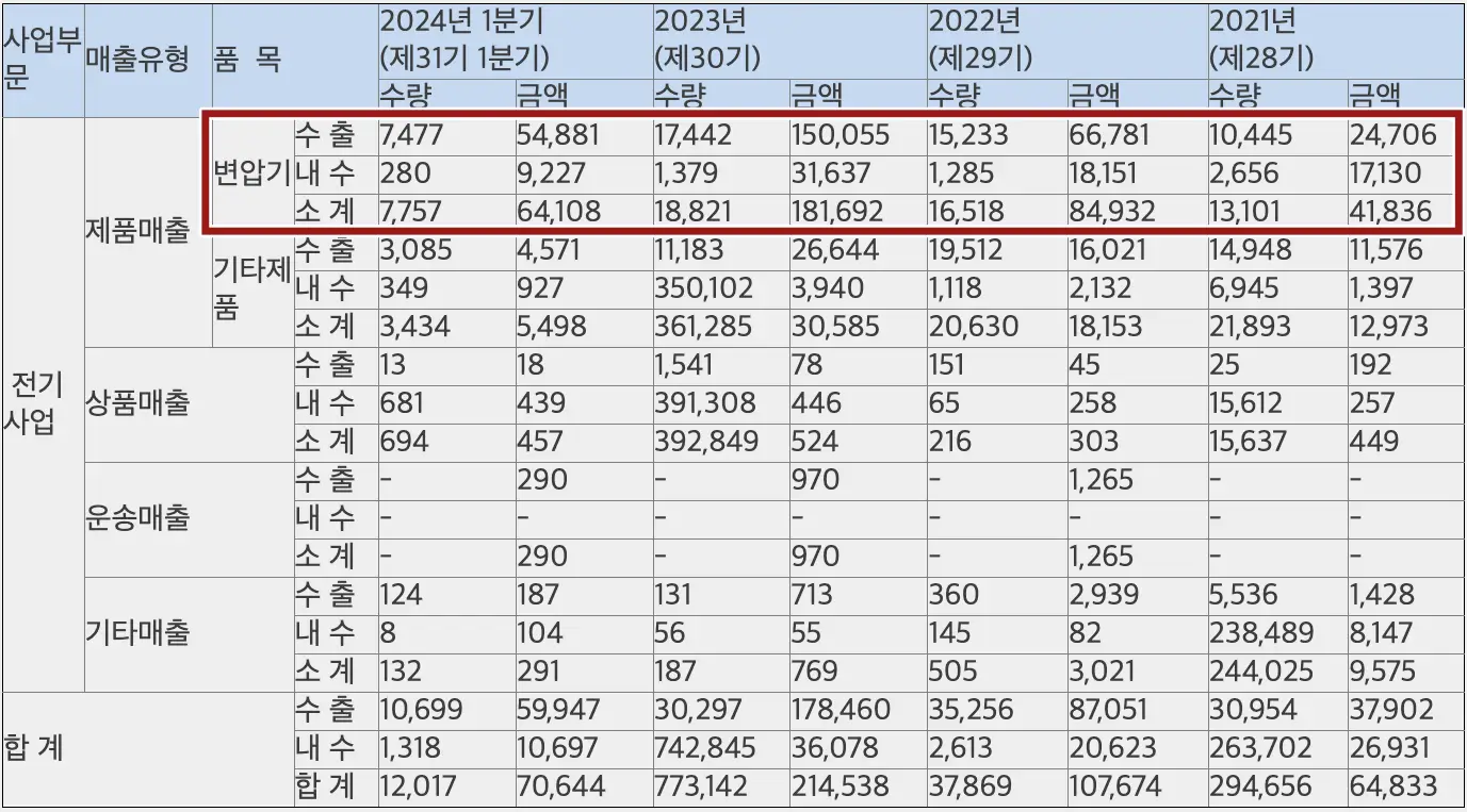 변압기 교체주기와 인공지능(AI) 데이터 센터 건립, 신재생에너지, 자동차 수요 증가에 다른 수요증가로 큰 성과를 내고 있는 기업입니다.