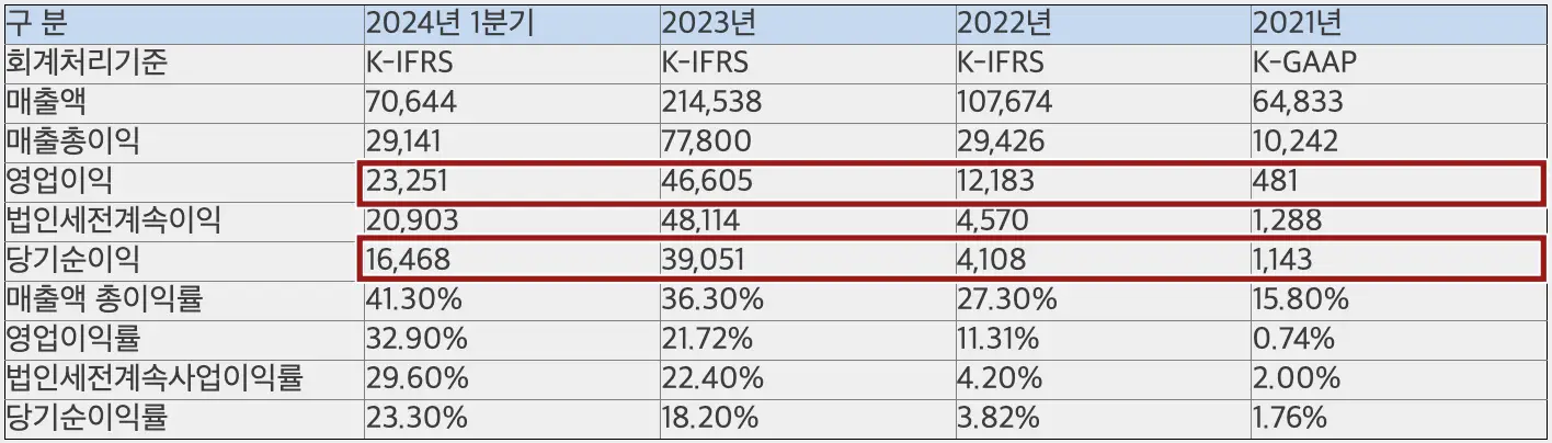 2023년 매출 2,145억에 영업이익 466억을 기록했으며 2024년 1분기 이미 지난해 매출과 영업이익에서 50%를 달성, 미국의 변압기 슈퍼사이클 및 AI 대용량 전력수급 등의 호재가 산일전기에 긍정적으로 작용할 것으로 보입니다.