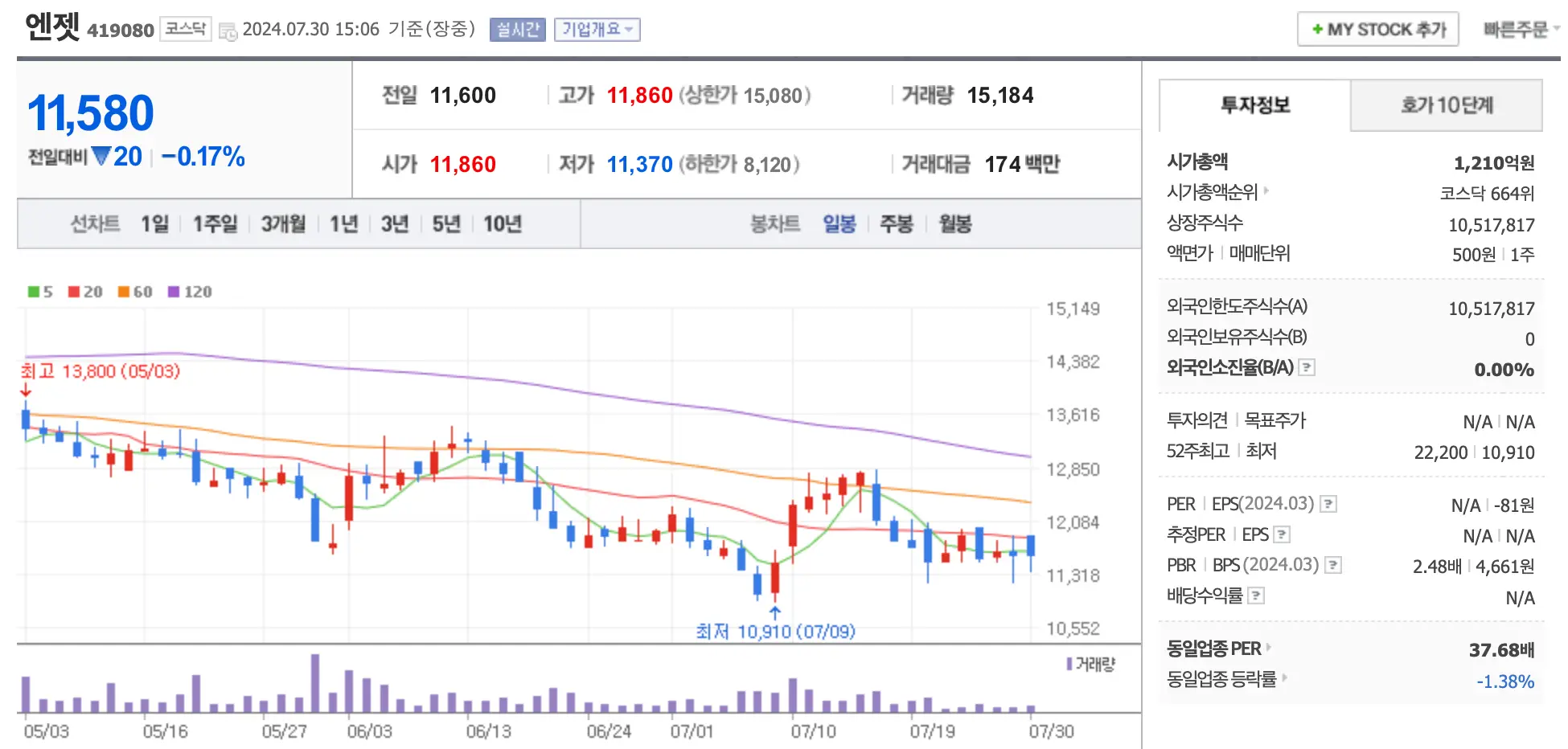 엔젯의 주가는 7월 30일 현재 전일보다 0.17% 하락한 11,580원에 거래 중이며 시가총액은 1,210억 원으로 코스닥 664위를 차지하고 있습니다.