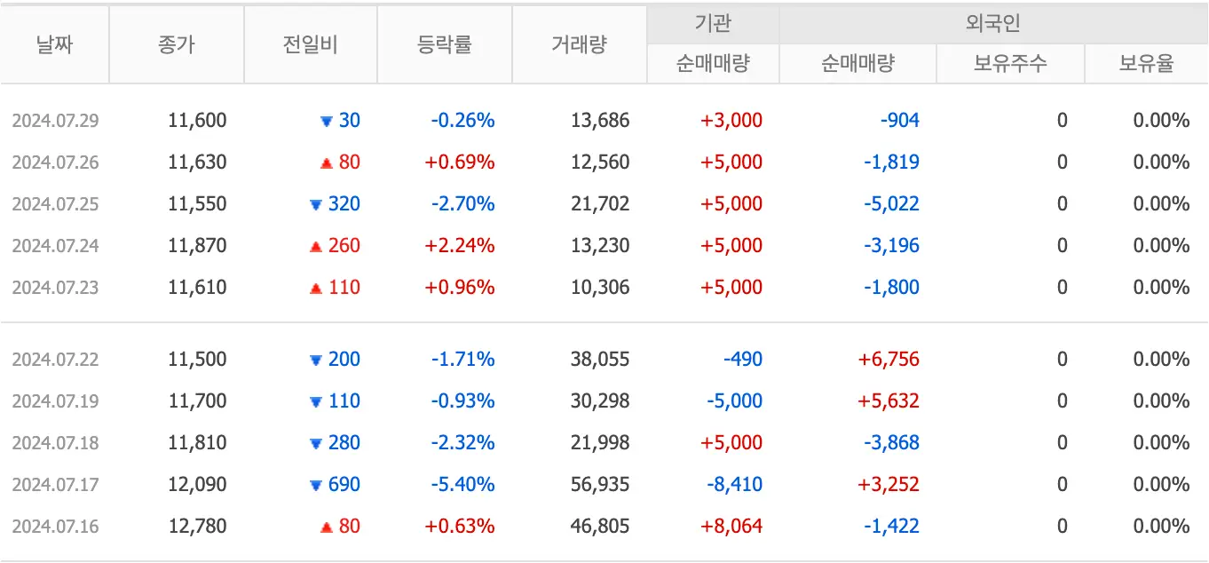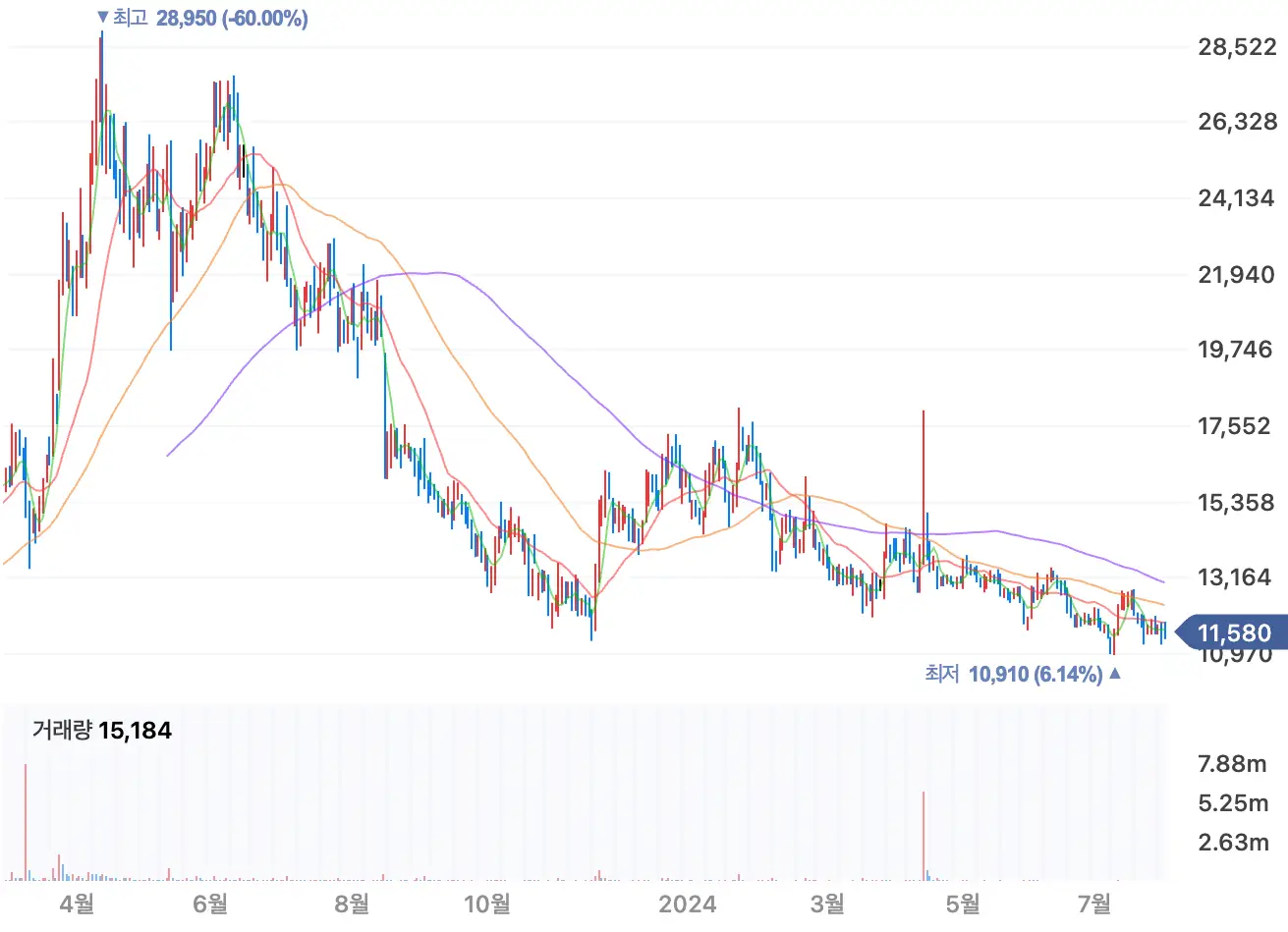 지난 4월 12일 최고가 28,950원을 기록한 후 줄곳 하향곡선을 그리며 11,580원으로 최고가 대비 60%나 하락한 모양새를 보이고 있습니다.