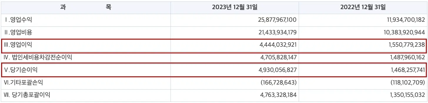 엠 83의 대표작들이 흥행에 성공하면서 2023년 매출은 421억, 영업이익 43억으로 흑자전환에 성공했습니다.