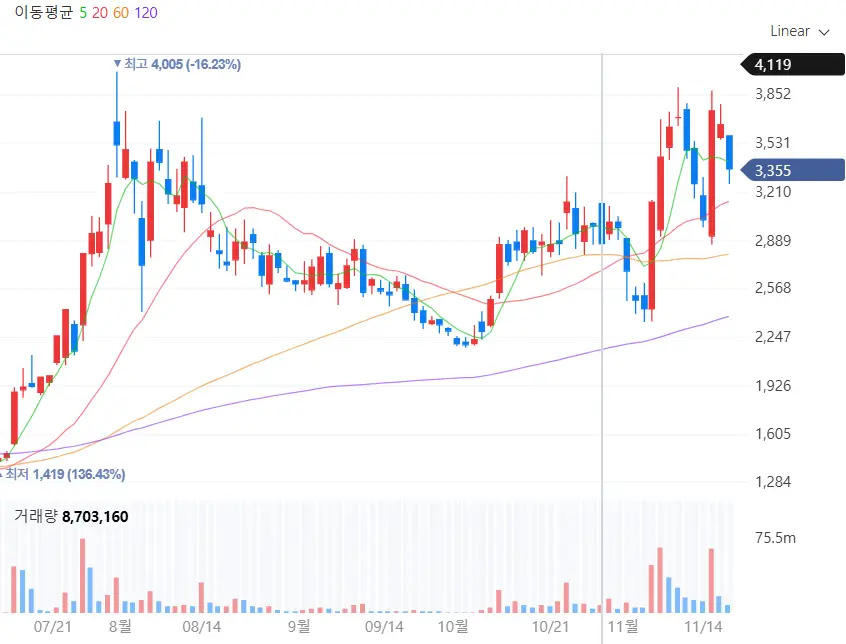 - 시가총액 및 현재주가 : 3,176억 / 3,375원