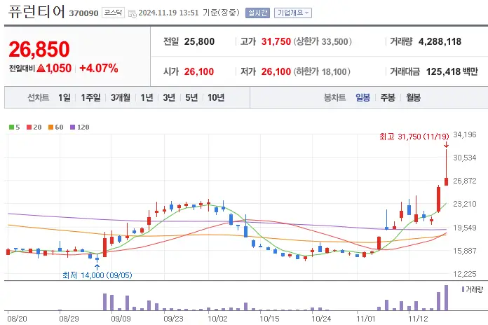 대량수급이 몰리며 시장 전반적인 관심을 한 몸에 받고 있는 퓨런티어가 있죠.