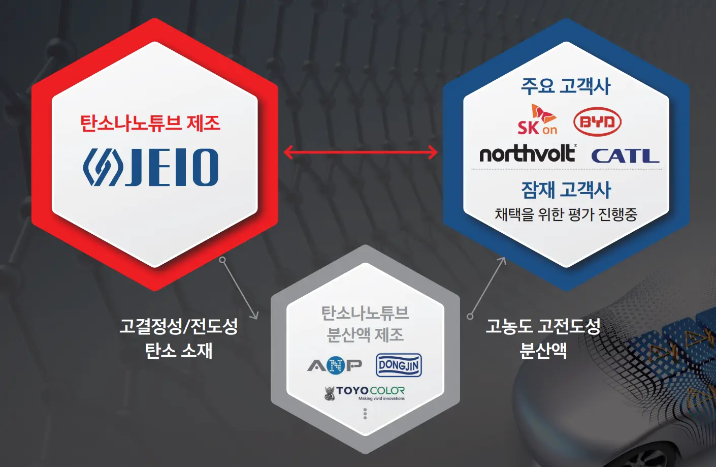 현재 고순도 CNT를 공급할 수 있는 제조사는 극소수이며 세계유일 탄소나노튜브(CNT) 풀라인업을 보유, MWCNT와 TWCNT를 독자 개발하여 양산 공급사는 세계적으로 제이오가 유일합니다.