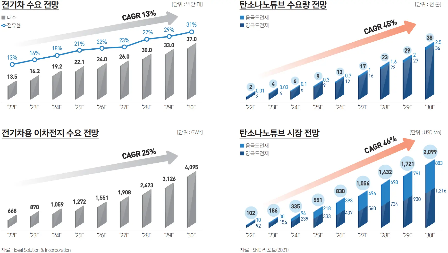 탄소나노튜브는 기존 도전재인 카본블랙의 양을 소량으로 대체, 전기차용 배터리 용량을 증가시키고 효율성과 충전속도를 획기적으로 향상, 구현하는 소재로 활용, 전자기파 간섭 제어를 위한 전기전도성 제품 및 자동차 외장부품용 플라스틱으로도 활용이 가능합니다.