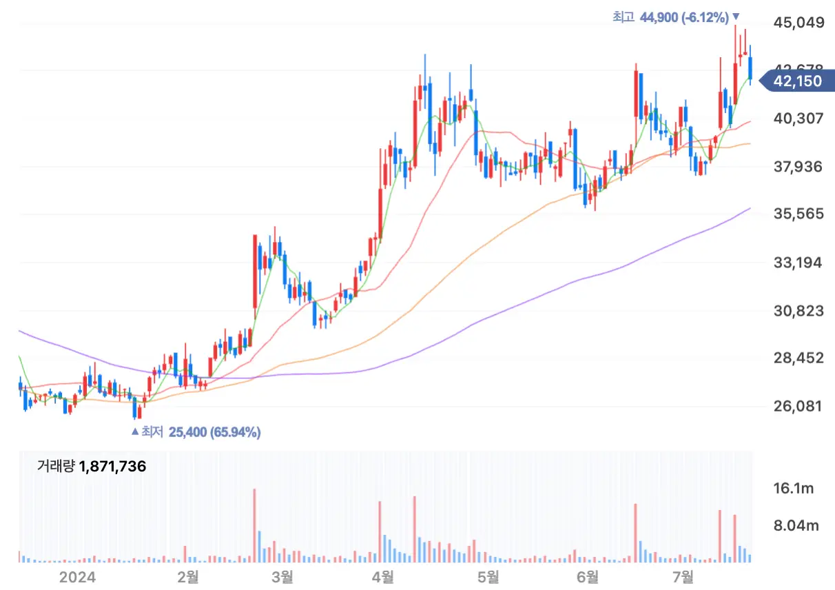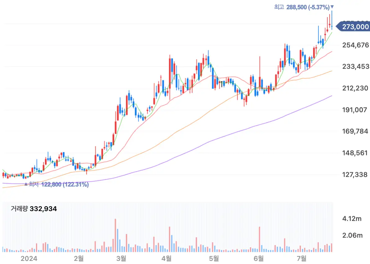 주가 역시 지난 1월 122,800원을 시작으로 줄곳 우상향의 모습을 보이고 있습니다.