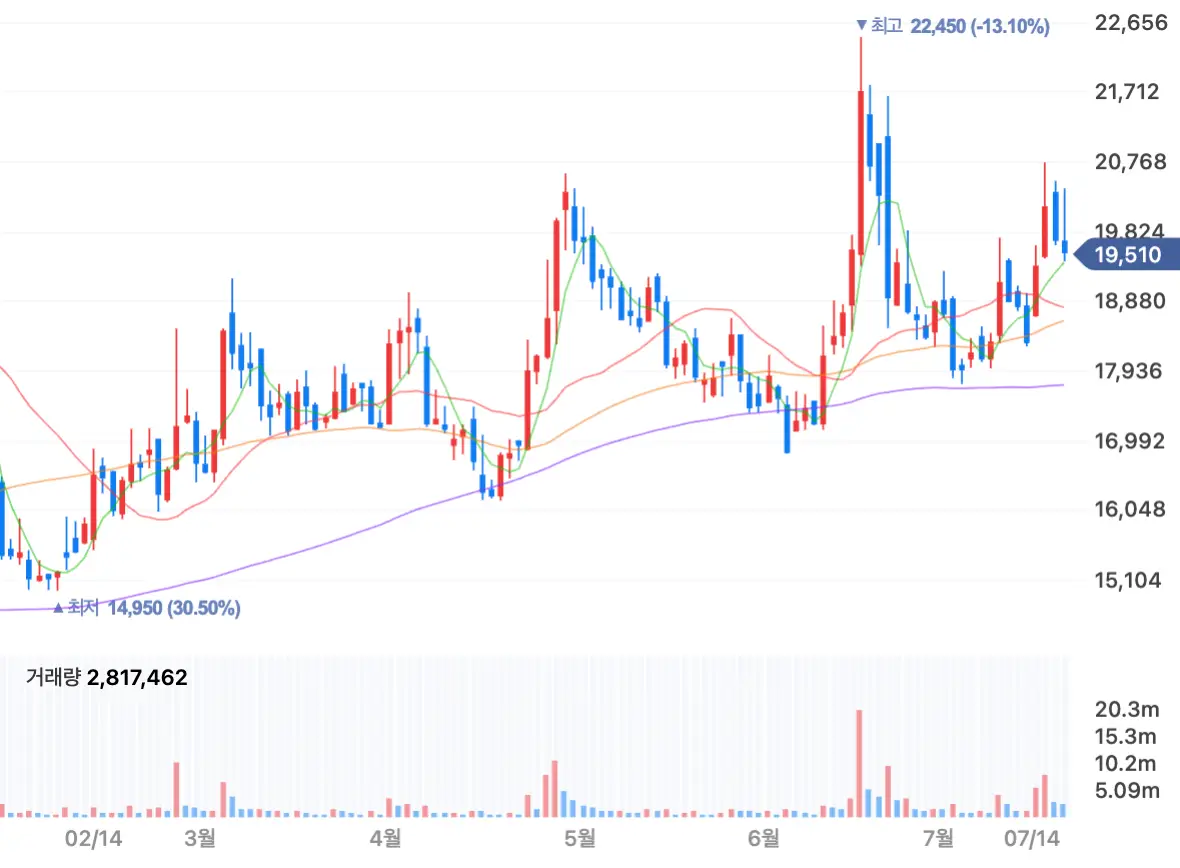 시가총액 5조 690억으로 현재 코스피 7위를 차지하는 기업으로 주가 역시 우상향의 아름다운 모습을 보이고 있습니다.