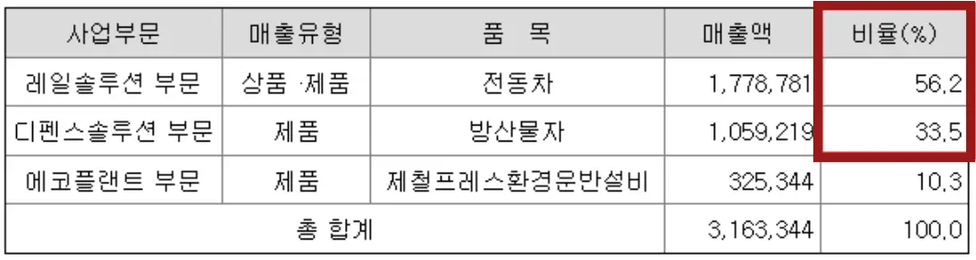 현대로템의 주요 매출은 자동차 관련사업에서 56%, 방산 관련사업에서 33.5%, 에코플랜트 부문이 10.3%를 차지하고 있습니다.
