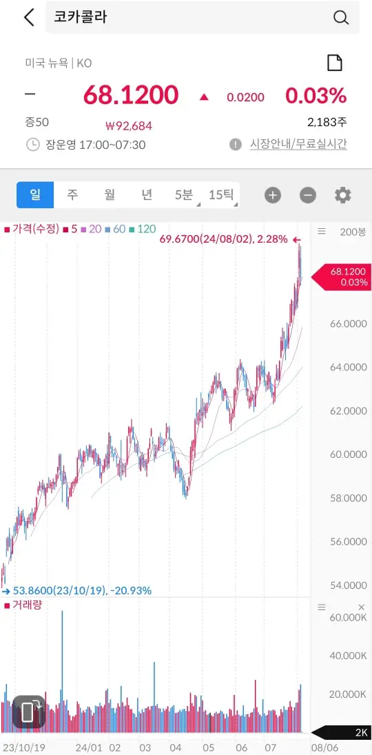 코카콜라 역시 최고의 경기 방어주의 역할을 합니다. 최근 워런버핏이 사들인 종목이라 더욱 큰 관심을 받고 있는데요 코카콜라 역시 지난 4월 16일 이후 14.8%나 오르며 가파른 상승세를 보여주고 있습니다.