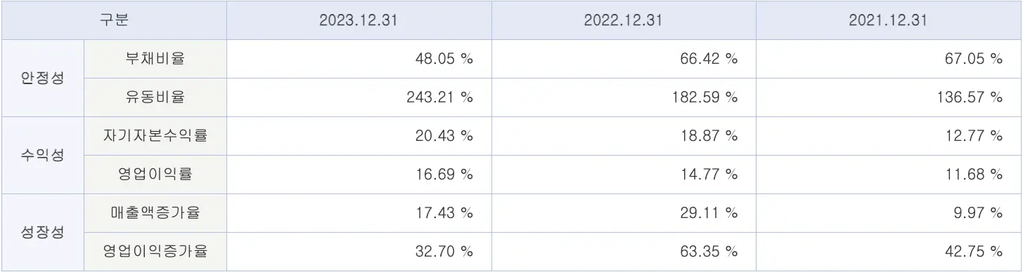 2021년 매출 198억에서 2022년 256억을 포함 3년 연속 상승하고 있는 기업으로 영업이익률은 2021년 11.68%에서 가파르게 상승 2023년 16.6%를 기록하고 있습니다.