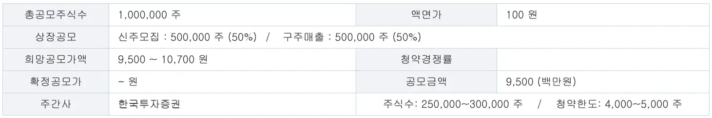 희망공모가는 9,500원~10,700원으로 확정공모가는 최상단 10,700원으로 예상하고 있으며 공모자금은 운영 및 시설자금으로 쓰일 예정입니다.