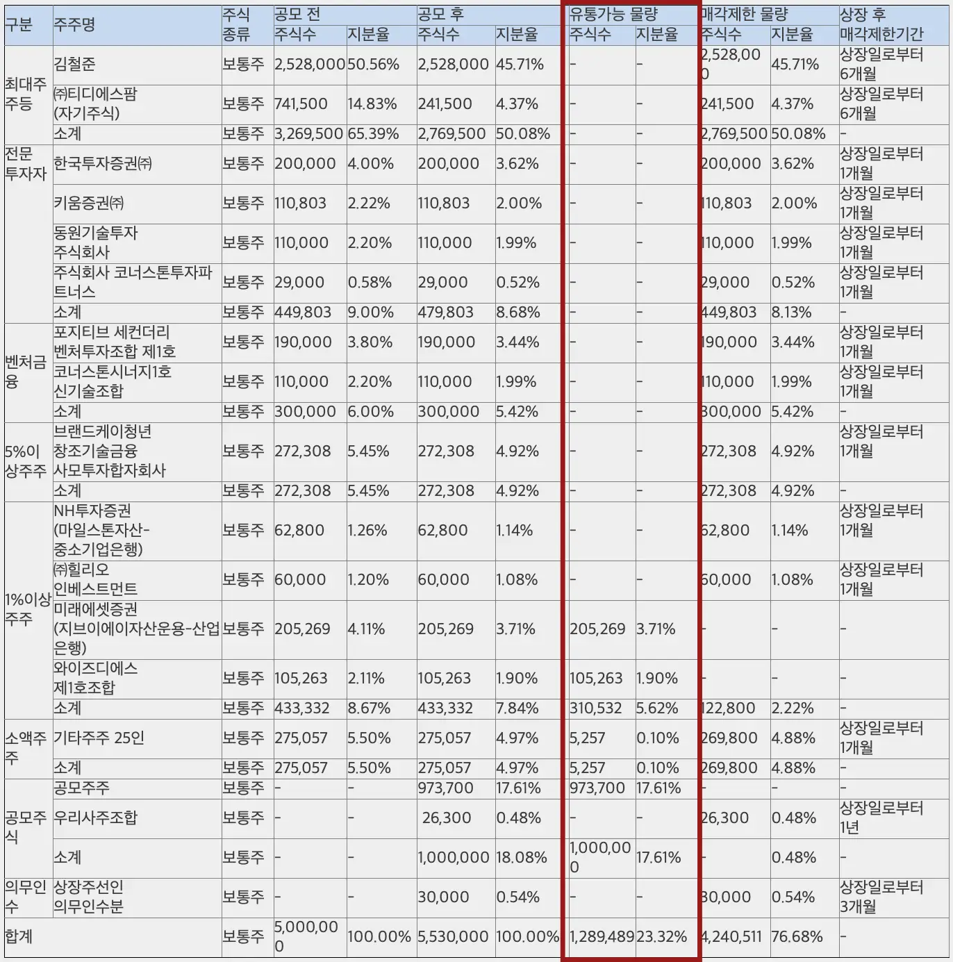 최대주주로 김형준 대표가 45.71%로 가장 큰 비중을 차지하고 있으며 상장일로부터 1개월 후 유통물량은 25.58%로 꽤 많은 물량이 유통될 예정으로 상장 시 단기매매 후 한 달 뒤 다시 접근하는 방법이 좋을 것으로 보입니다.