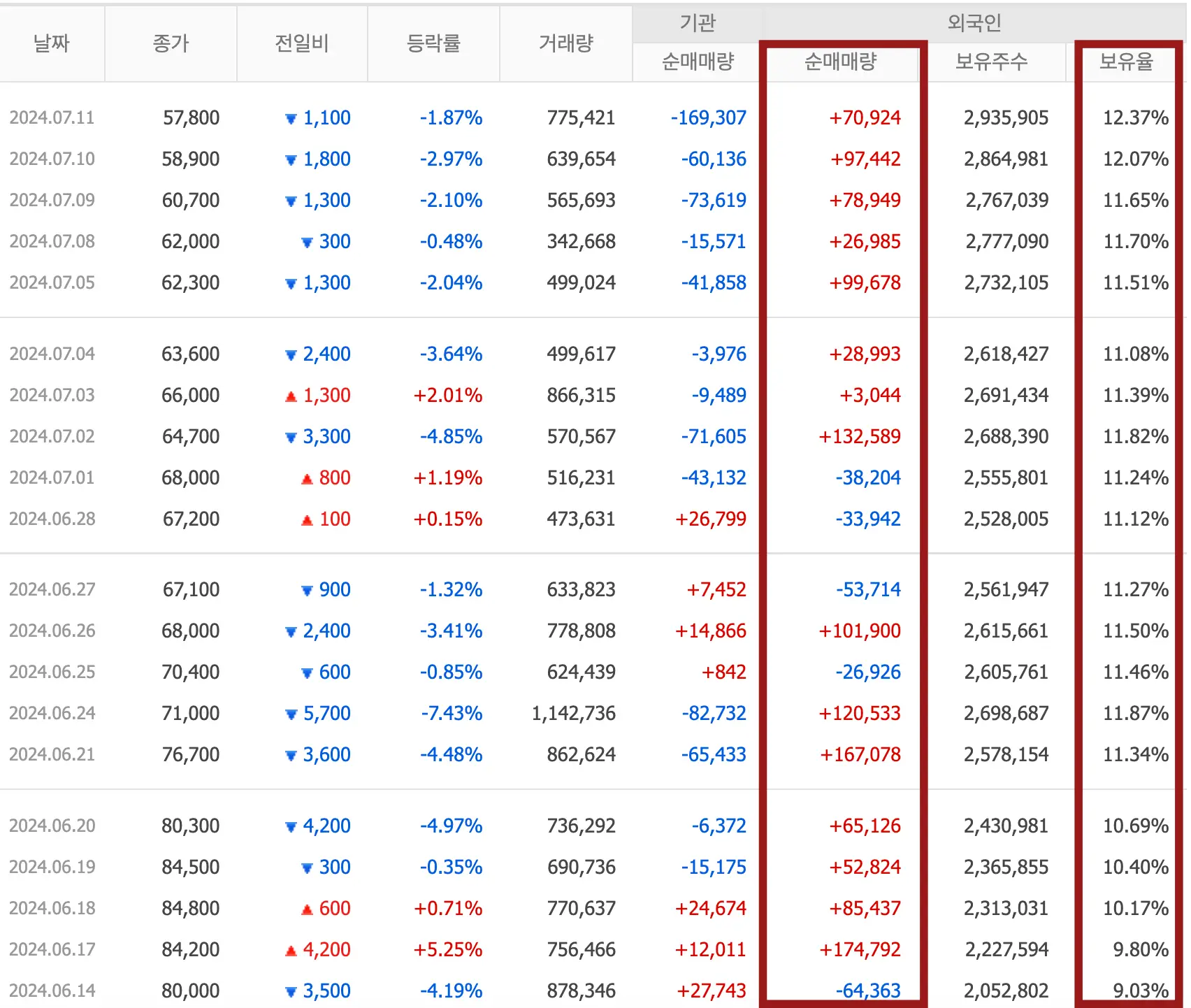 기관은 최근 꾸준히 매도하며 주가하락을 주도하고 있습니다.
