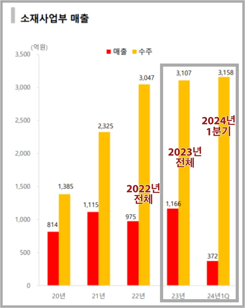 피엔티의 수주 중 70% 이상이 2차 전지에서 그 외는 소재사업등에서 큰 수주능력을 보이고 있는데요 2024년 1분기에 벌써 지난 2023년 전체의 수주를 뛰어넘을 만큼 급격한 상승세를 보이고 있습니다.