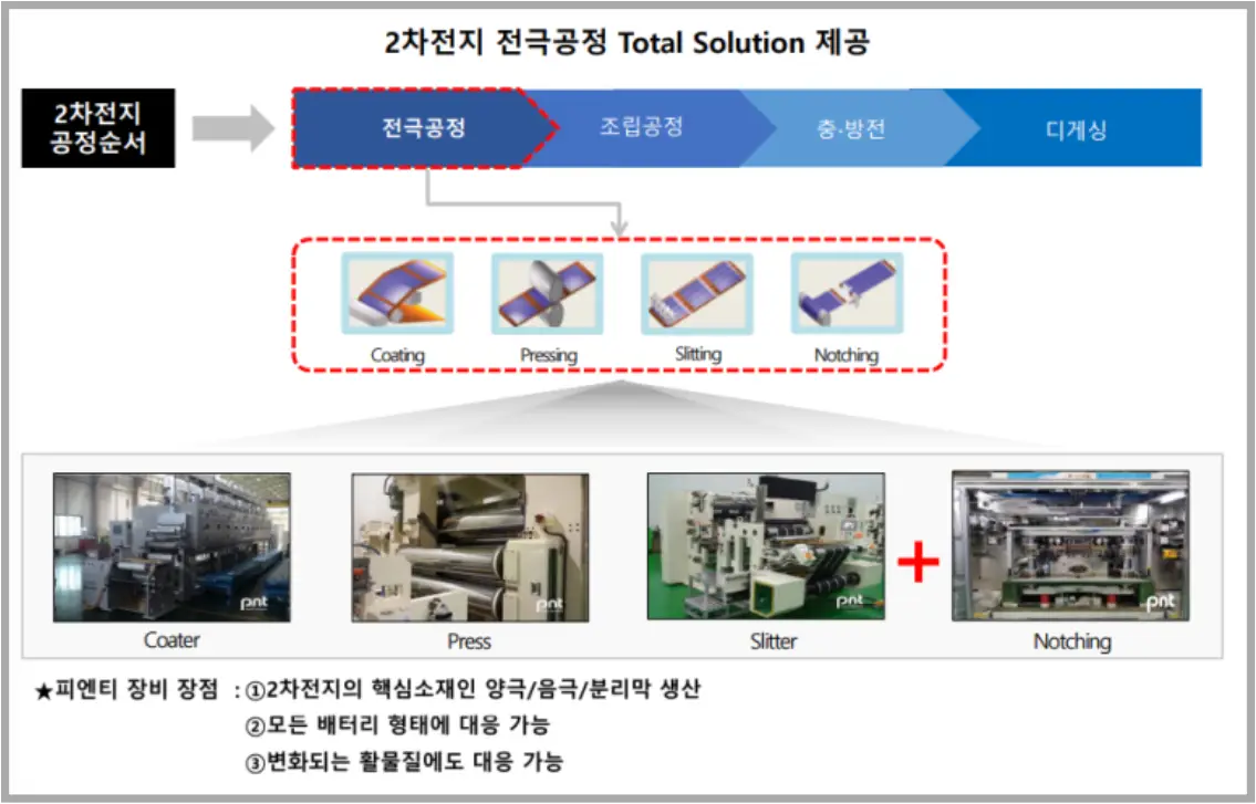 피엔티는 2003년 창립한 회사로 Roll to Roll 공법을 바탕으로 한 IT소재 및 Cooper(LS 엠트론 독점 공급)등의 코팅 및 슬리터 장비, 2차 전지 음극 및 분리막 소재의 제조 및 판매를 주요 사업으로 하고 있습니다.