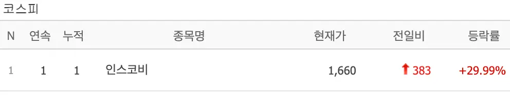 코스피종목에서 유일하게 상한가에 이른 인스코비는 지난 1월에 갱신한 52주 신고가 1,480원을 넘어서 1,600원에 무사히 안착했습니다.