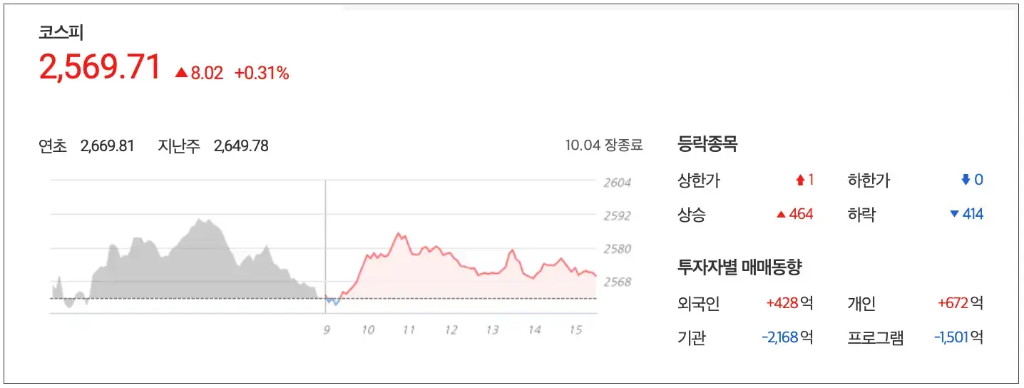 외국인과 개인의 순매수로 이어지며 지난 2일보다 0.31% 상승한 2,561.71 point로 2,600선 회복을 위해 시동을 걸고 있는 모습을 보였습니다.