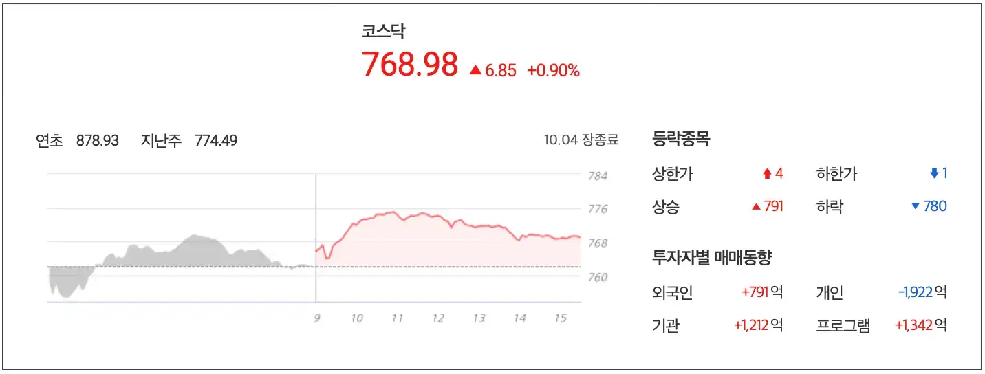코스닥의 거래대금은 총 5조 원으로 외국인과 기관이 매수주체가 되어 0.9% 상승한 768.98%로 장을 마감했습니다.