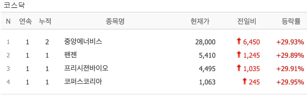 10월4일 오늘의 상한가 종목분석-인스코비,중앙에너비스,프리시젼바이오,코퍼스코리아,팬젠
