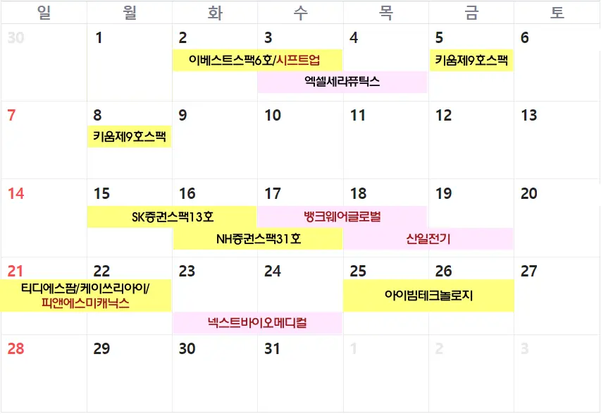 특히 짭짤한 수익을 안겨줄 대어주들이 첫째 주와 셋째 주, 넷째 주에 몰려있으니 이때를 노려본다면 월말엔 미소 지을 수 있을듯합니다.