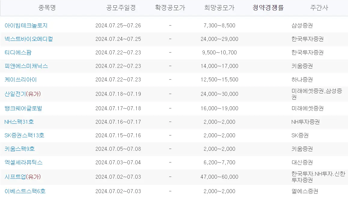| 산일전기 | 7.18~19 | 24,000~30,000 | 미래에셋증권/삼성증권 |