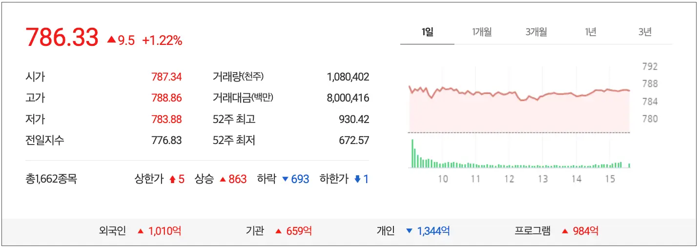 8월 9일 마감장 시황으로 코스피는 2.57% 상승한 764.43 point로 마감 외국인은 총 507억을 매수했고 기관은 745억 매수했으며 개인은 1,205억을 매도로 기관과 외국인이 쌍끌이로 매수한 장세를 보였습니다.