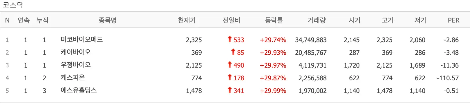 미코바이오메드 / 에스비비테크 / 웰크론 / 녹십자엠에스 / 올리패스 / 제놀루션 / 홈캐스트 / 라메디텍 / 젠큐릭스 / 빌리언스 / 그린생명과학 / 스레스티지바이오로직스 / 피씨엘 / 엔켐 / 오상자이엘 / 테크윙 / 그린리소스 / 소니드 / 케이엠 / 실리콘투 / 포니링크 / 세니젠 / 에스티오 / 메가엠디 / 한국정밀기계 / 바이넥스 / 케이피에스 / SAMG엔터 / 한창산업 / 진매트릭스 / 큐리언트