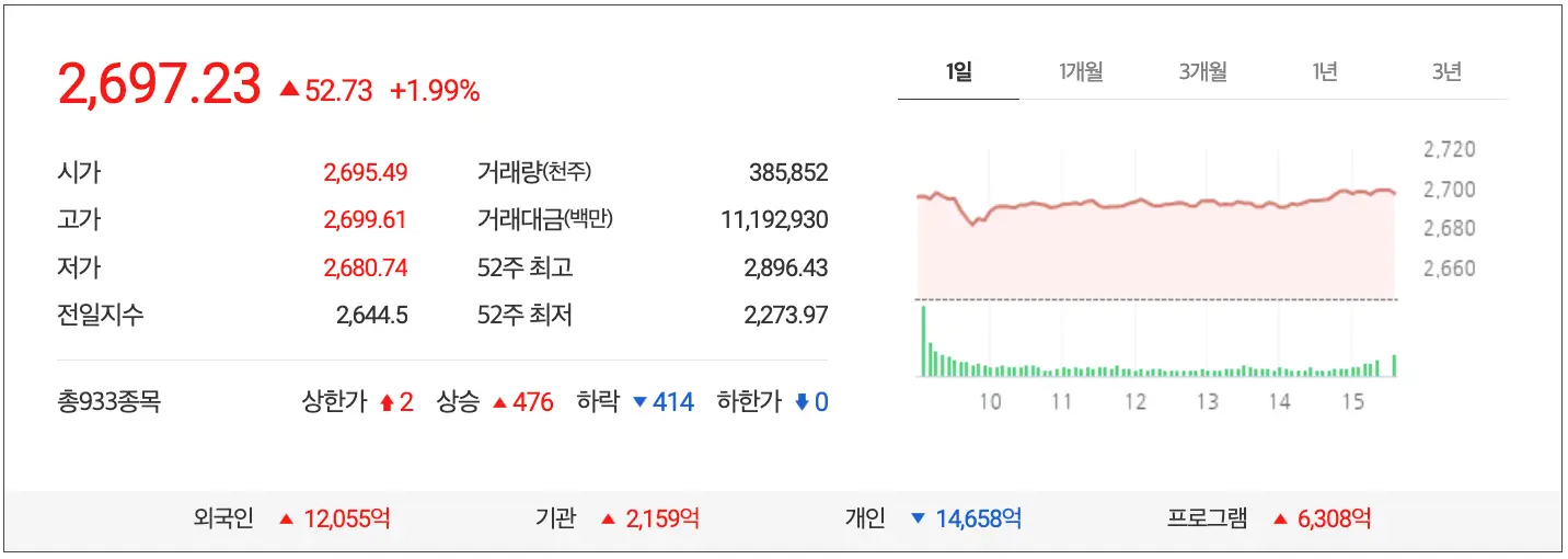 8월 9일 마감장 시황으로 코스피는 2.57% 상승한 764.43 point로 마감 외국인은 총 507억을 매수했고 기관은 745억 매수했으며 개인은 1,205억을 매도로 기관과 외국인이 쌍끌이로 매수한 장세를 보였습니다.