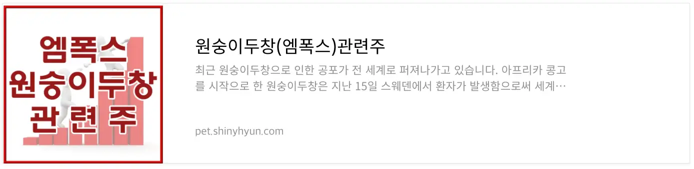 지난 15일 스웨덴에서 원숭이두창 확진자가 처음으로 발생했다은 소식에 세계보건기구는 원숭이두창 확산을 우려, '국제적 공중보건사태'를 선언했죠. 이에 발 빠르게 해당 종목 군에서 전반적인 상승세를 보인 하루였습니다.