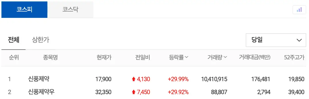 코스피의 상한가종목은 총 2 종목으로 신풍제약과 신풍제약 우선주가 상한가에 안착했습니다.