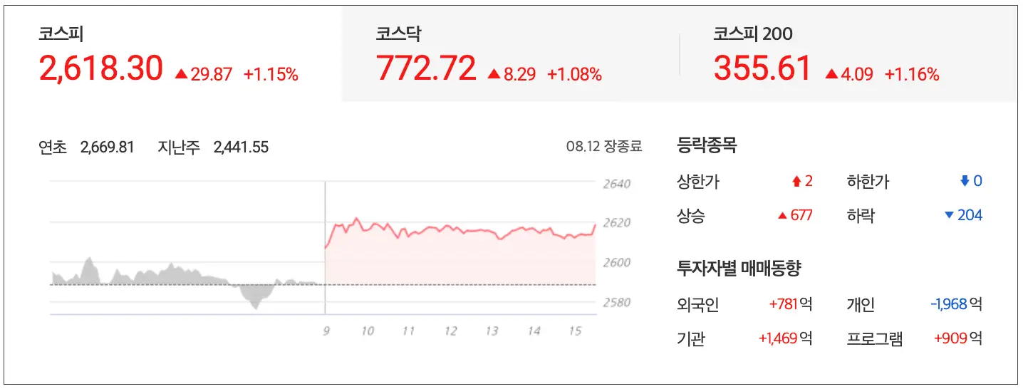 8월 12일 마감장 시황으로 코스피는 1.15% 상승한 2,618.30 point로 마감 외국인은 총 781억을 매수했고 기관은 1,469억 매수했으며 개인은 1,968억을 매도했습니다.