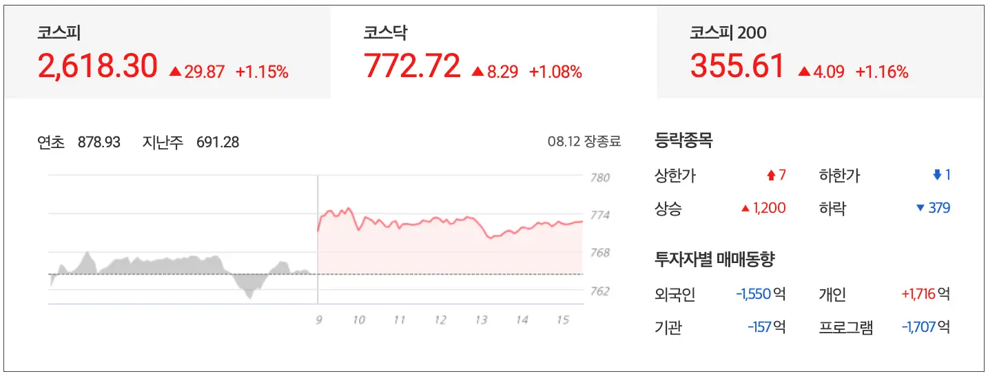8월 12일 마감장 시황으로 코스피는 1.08% 상승한 772.72 point로 마감 외국인은 총 1,550억을 매도했고 기관은 157억 매도했으며 개인은 1,716억 매수로 기관과 외국인이 쌍끌이로 매수한 장세를 보였습니다.