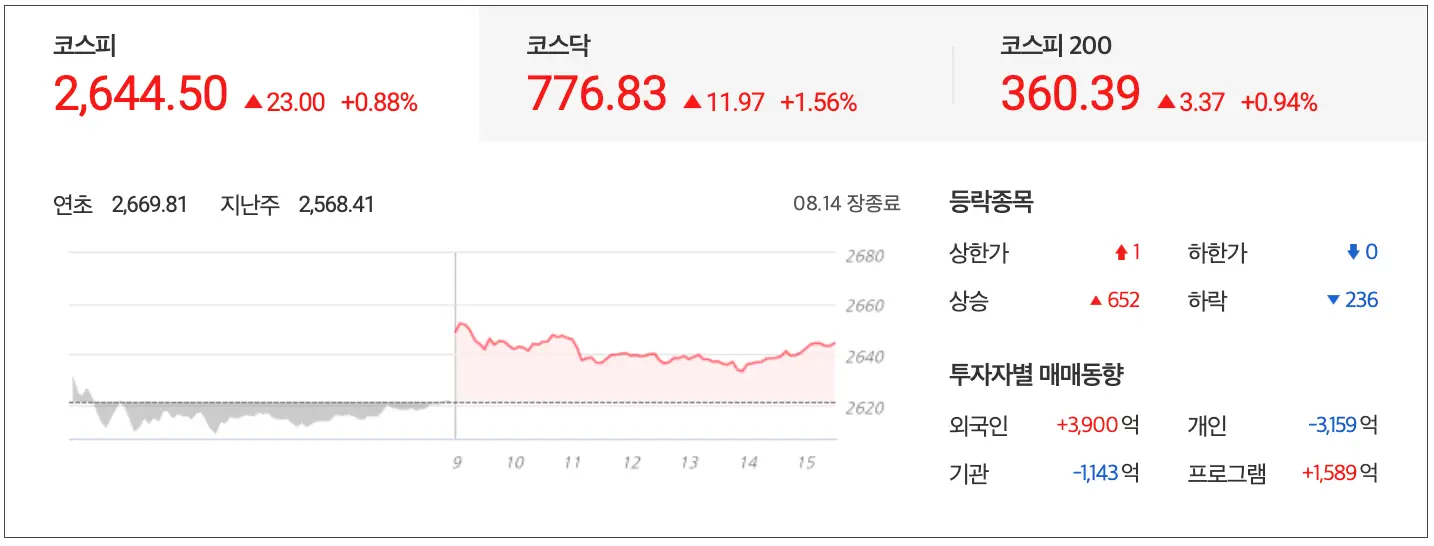 코스피는 0.88% 상승한 2,644.50 point로 마감 외국인은 총 3,900억을 매수했고 기관은 1,143억, 개인은 3,159억을 매도였으나 외국인과 기관의 매수가 지수의 상승을 이끌었습니다.