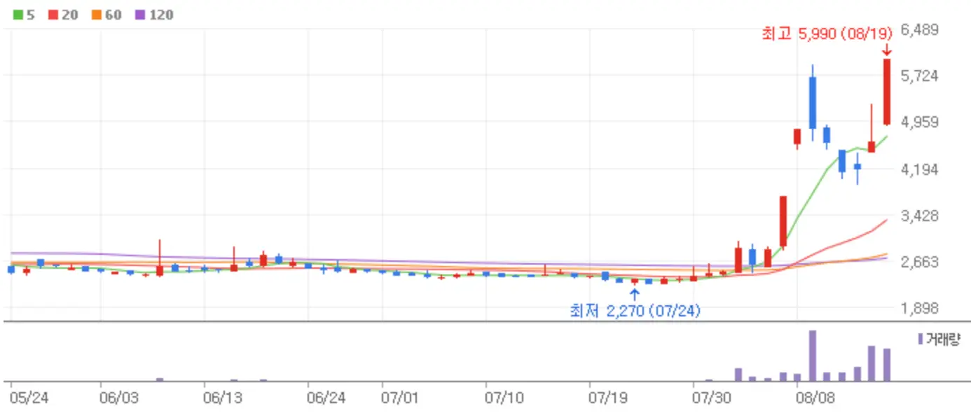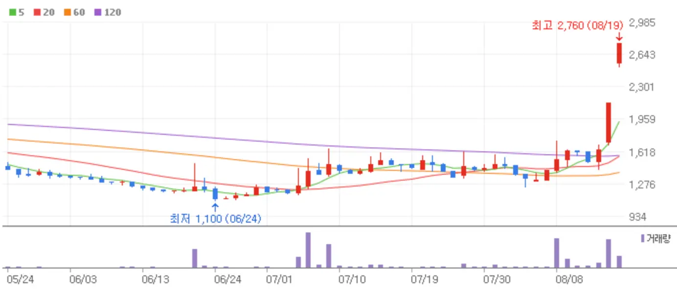 우정바이오 역시 엠폭스에 관한 이슈로 상한가에 안착했는데요 해당 종목은 올 상반기 영업이익 1억 4,900만 원을 기록하며 흑자전환의 이슈까지 함께 붙어 시원한 상한가를 기록했습니다.