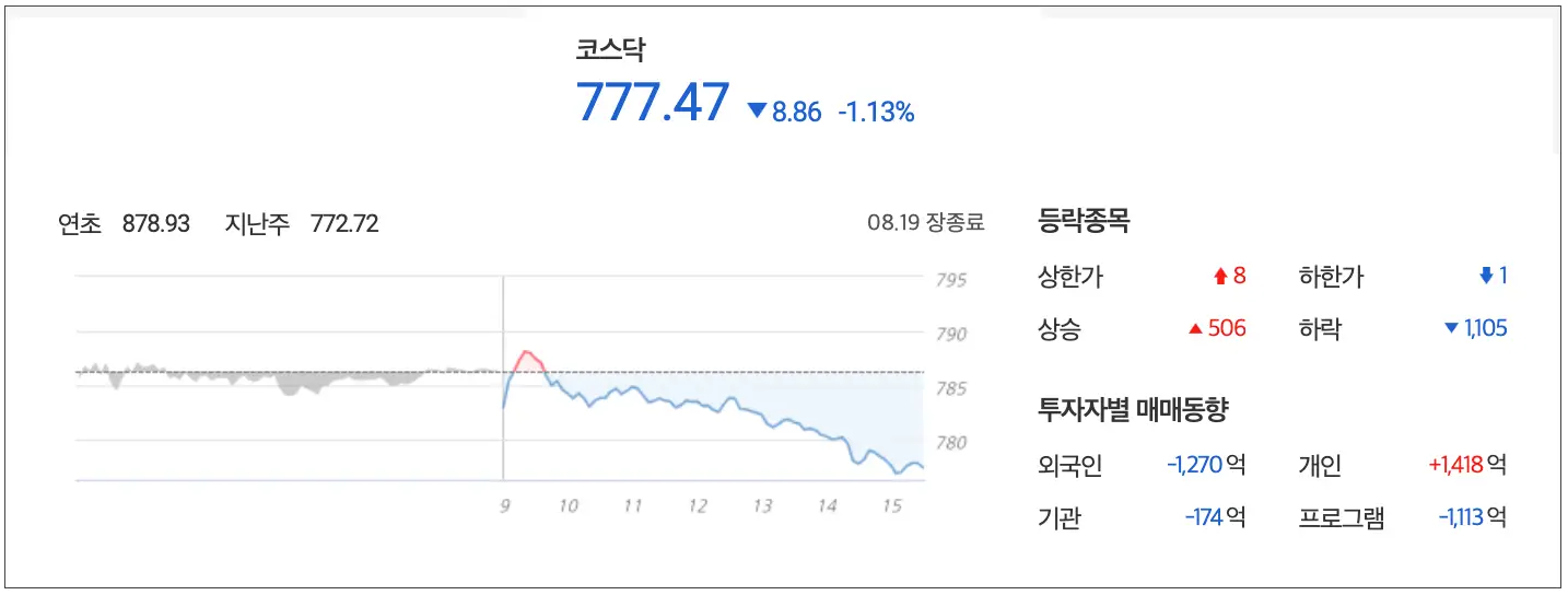 코스닥은 1.13% 하락한 777.47 point로 마감, 외국인과 기관은 총 1,270억과 174억을 매도했고 개인만 1,418억 매수했습니다.