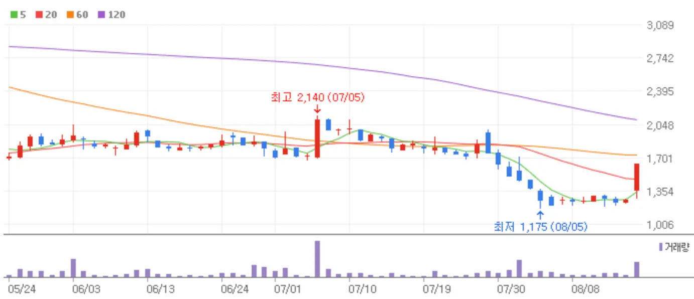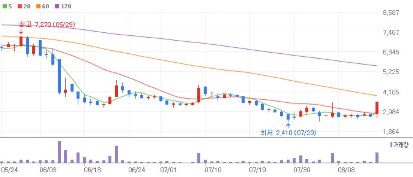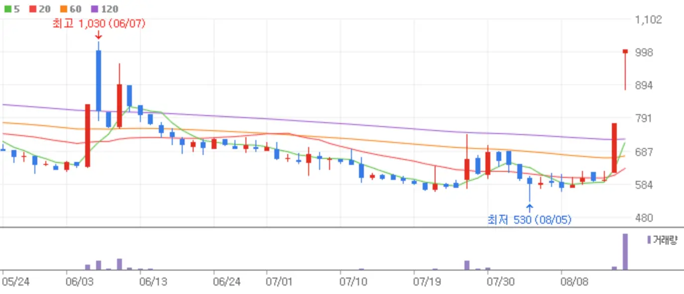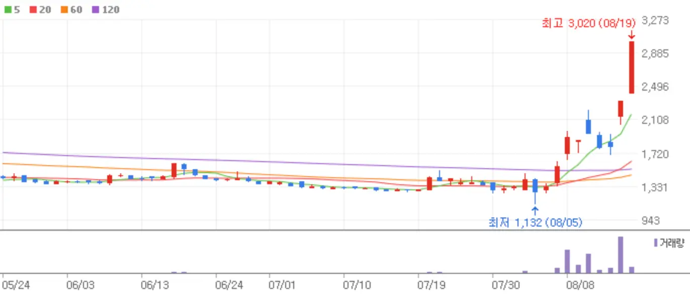 우정바이오 역시 엠폭스에 관한 이슈로 상한가에 안착했는데요 해당 종목은 올 상반기 영업이익 1억 4,900만 원을 기록하며 흑자전환의 이슈까지 함께 붙어 시원한 상한가를 기록했습니다.