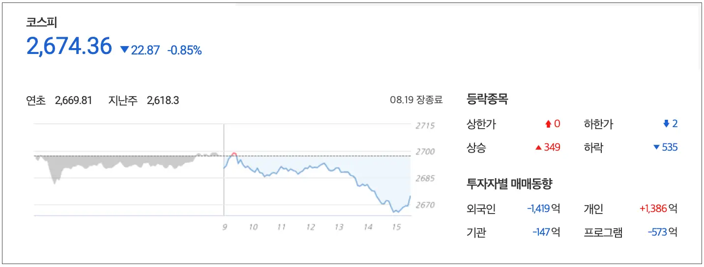 8월 19일 마감장 시황으로 코스피는 0.85%% 하락한 2,674.36 point로 마감 외국인과 개인은 각각 총 1,419억과 147억을 매도했고 개인은 1,386억 매수했으나 주가하락에는 역부족의 모습을 보였습니다.