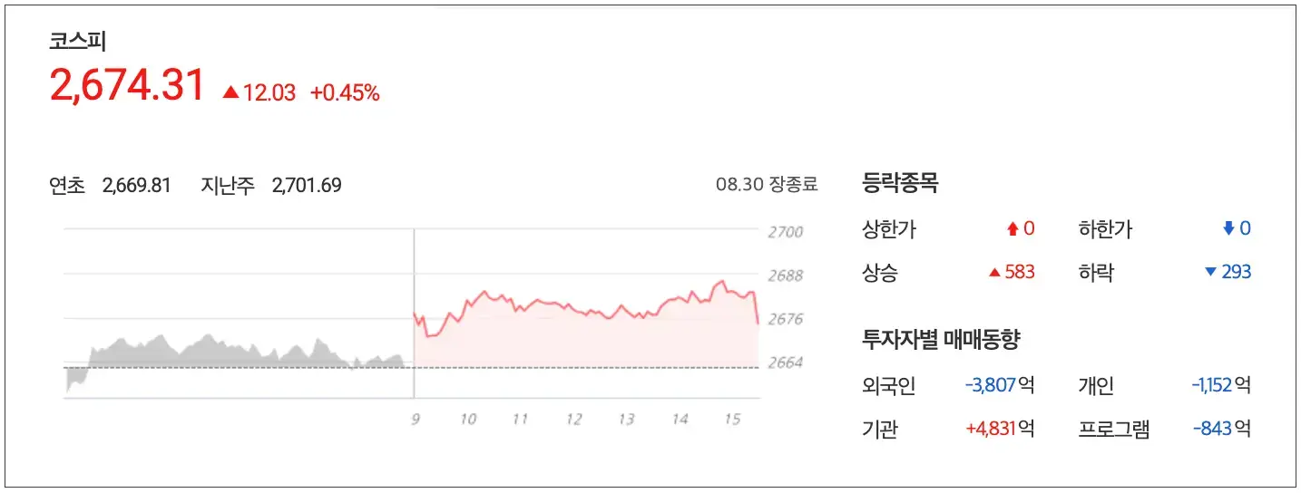 코스피는 전날의 하락폭을 다소 상쇄시키며 0.45% 상승한 2,674.31 point로 마감 외국인과 개인은 각각 3,807억과 1,152억을 매도했으며 기관만이 4,831억을 매수했습니다.