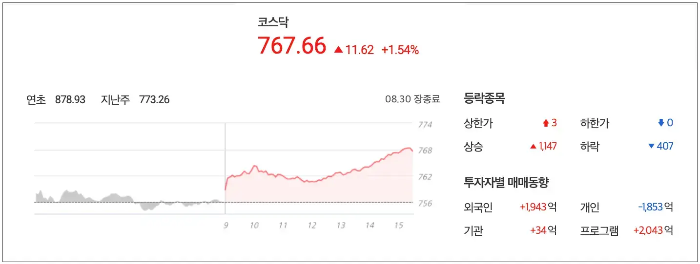 코스닥은 1.54% 상승하며 767.66 point로 마감 외국인과 기관은 총 1,943억과 34억을 매수했고  개인은 1,853억을 매도로 기관과 외국인이 쌍끌이로 매수한 장세를 보였습니다.