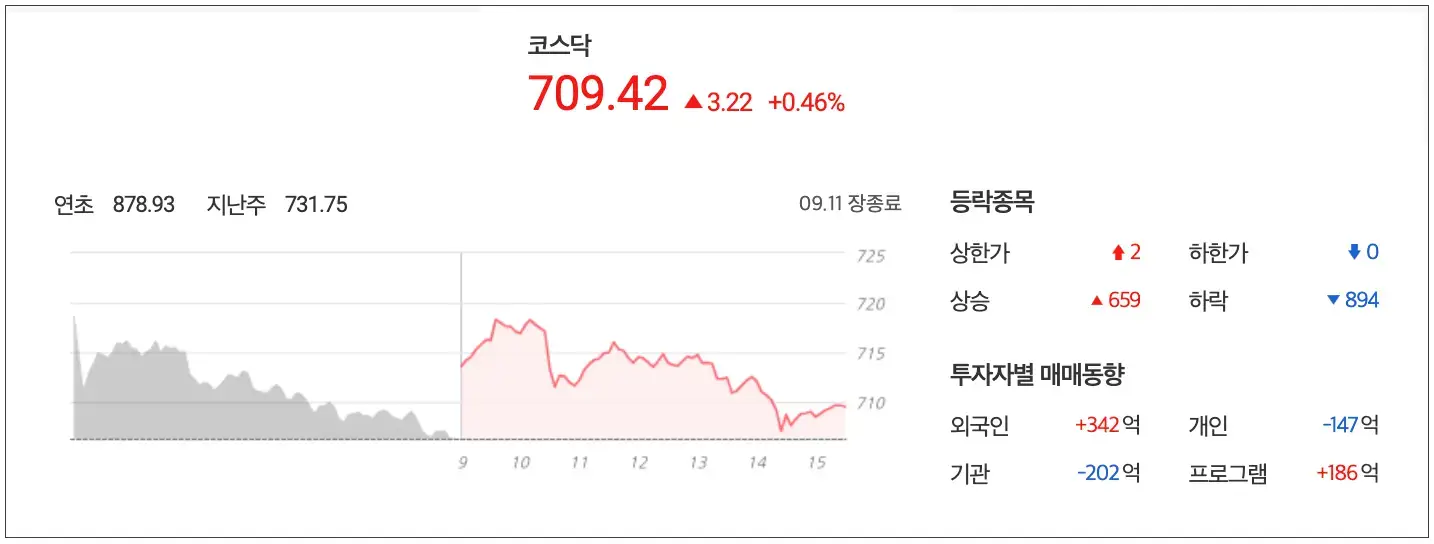 코스닥은 외국인이 342억을 주도적으로 매입하며 0.46% 상승한 709.42 point로 마감했습니다.