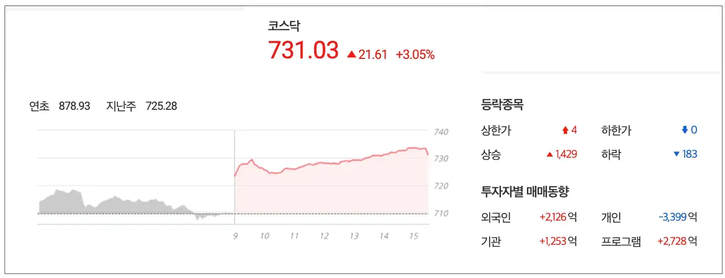 코스닥 역시 전거래일보다 3.05% 상승한 731.03 point로 마감 외국인과 기관이 각각 2,126억과 1,253억을 매수하며 큰폭의 상승을 기록했습니다.